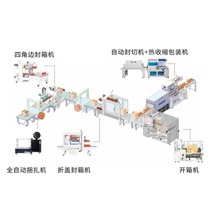 全自動(dòng)封切收縮機(jī)+動(dòng)力滾筒+開(kāi)箱機(jī)+折蓋封箱機(jī)+四角邊封箱機(jī)+全自動(dòng)打包機(jī)(可任意定制)