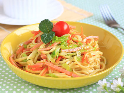 4.將雞肉絲,胡蘿卜,菠菜末與涼面拌勻,即可食用。